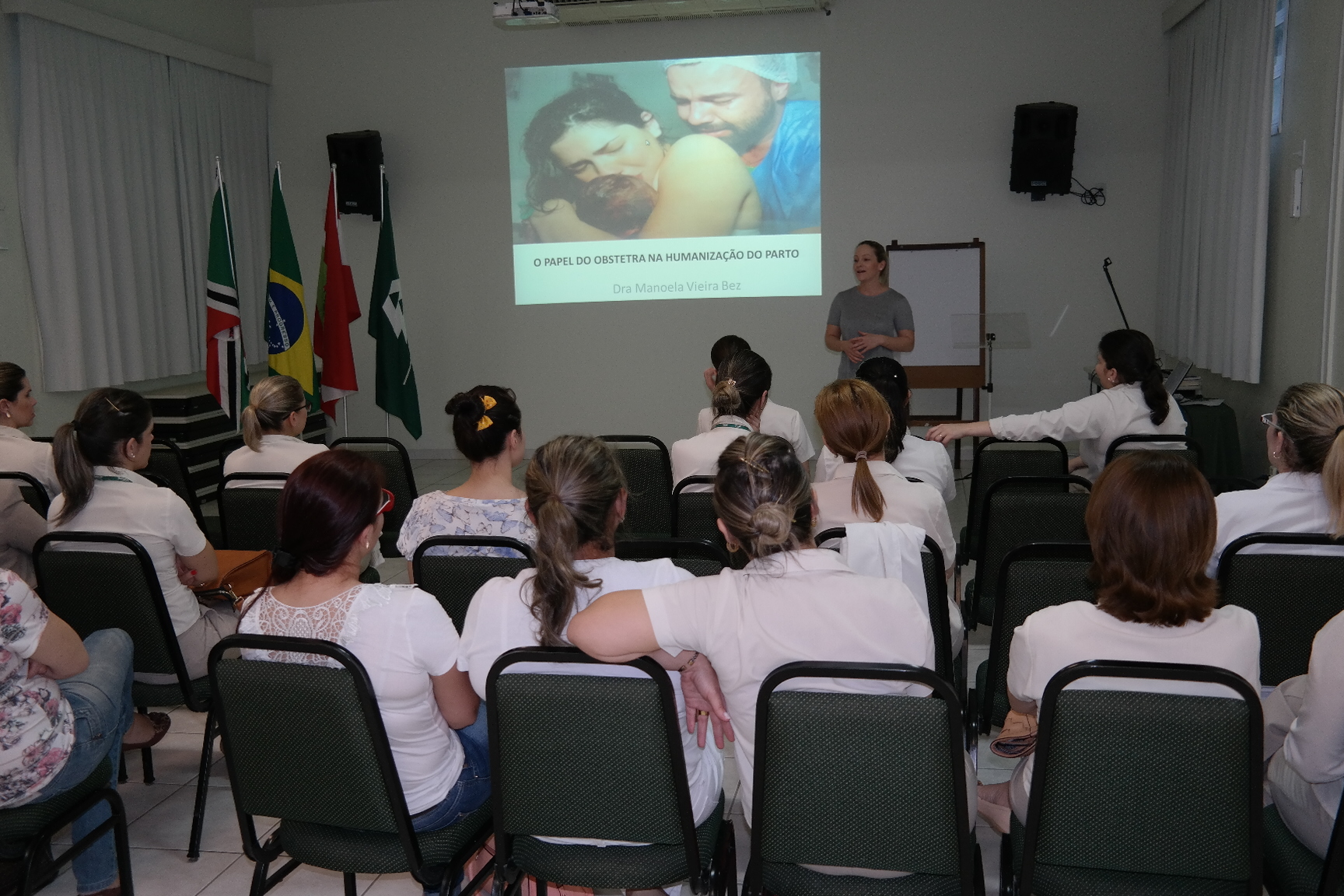 No encontro realizado no auditório da instituição, além do papel do obstetra na humanização do parto, assunto tratado pela médica Manoela Vieira Bez, os colaboradores também puderam saber um pouco mais sobre a assistência da equipe de enfermagem na humanização do parto, assunto que foi abordado pela enfermeira Manoela da Silva Bortoluzzi Mattos. “Nós queremos que todos saibam que o apoio à gestante deve ocorrer a partir do momento que ela chega ao hospital. Seja no psicológico, no emocional, nas técnicas não-farmacológicas que podem ser usadas ou nas caminhadas realizadas durante o trabalho de parto. Tudo isso irá dar mais conforto a gestante e teremos uma equipe cada vez mais preparada para bem atendê-la”, explica a enfermeira.