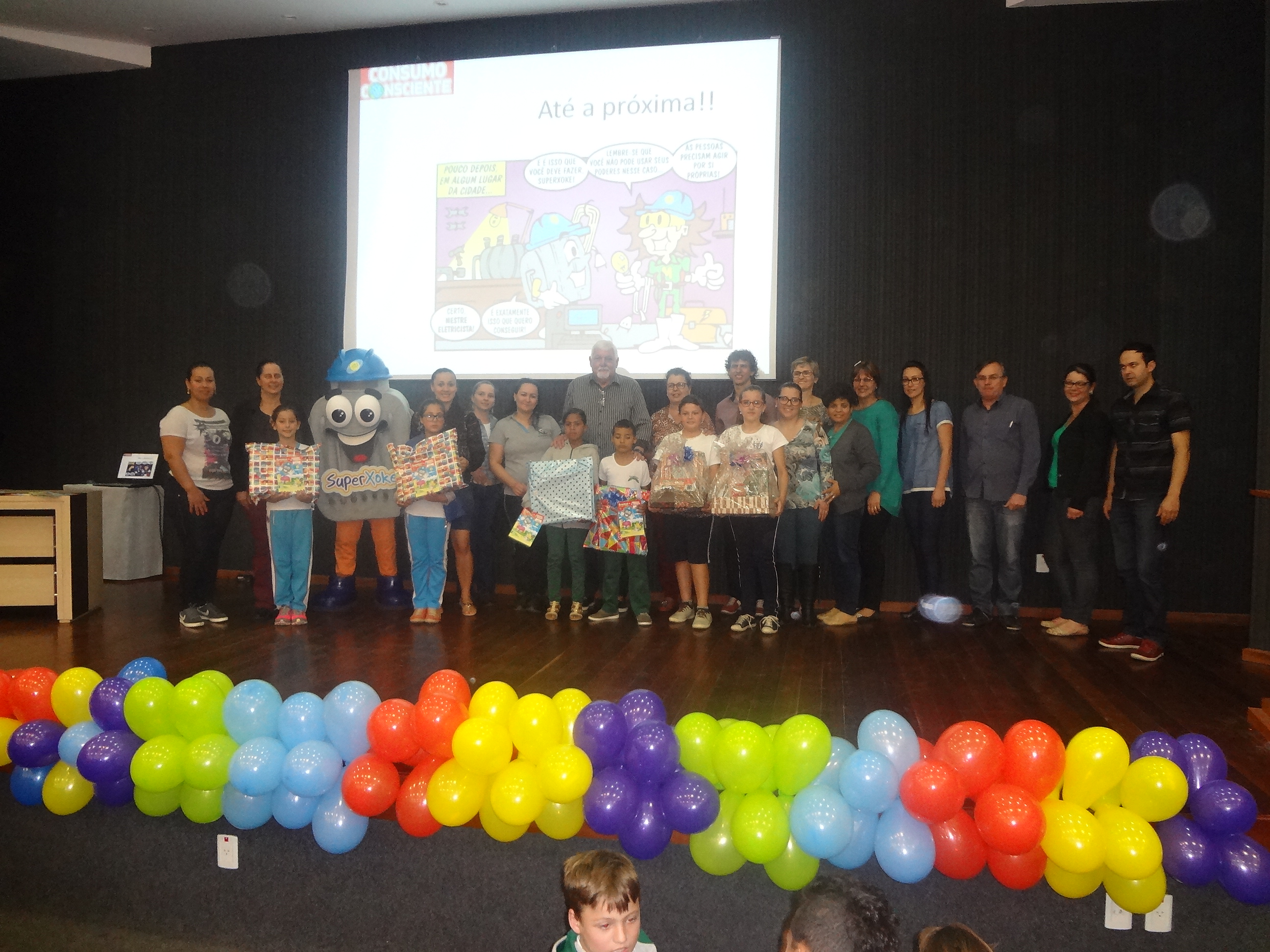 A Cooperativa Pioneira de Eletrificação – COOPERA, realizou na tarde da última quinta-feira, dia 26, o evento que marcou a entrega da premiação dos alunos participantes do Projeto “Revistinha do SuperXoke e sua turma”. O evento reuniu no auditório Alfredo Michels dezenas de crianças e professores. O Presidente da COOPERA Carlos Alberto Arns abriu o encontro falando da importância do projeto. “A intenção é divulgar junto a toda comunidade escolar a cooperação, a conscientização acerca da economia de água e energia elétrica, bem como a preservação do meio ambiente”, disse. Na abertura, um grupo de crianças do projeto Sinfonia de Talentos, da ABADEUS, também realizou uma apresentação de coro e cordas, encantando os presentes.