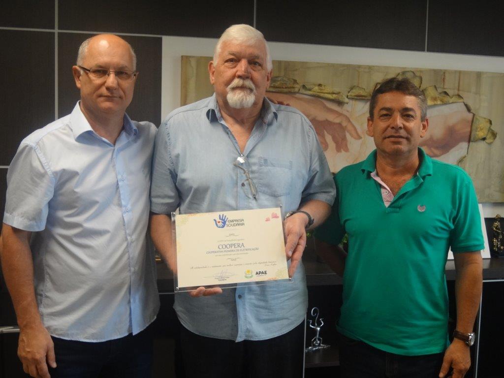 O Presidente da COOPERA Carlos Alberto Arns recebeu o certificado das mãos do Presidente da APAE Rogério Bráz Feller e do Vice-Presidente Neri Mário da Rosa.A cooperativa mantém a parceria há mais de um ano beneficiando dezenas de alunos. “Essa contribuição ajuda a viabilizar a execução de muitos projetos importantes para a instituição”, comentou Feller.