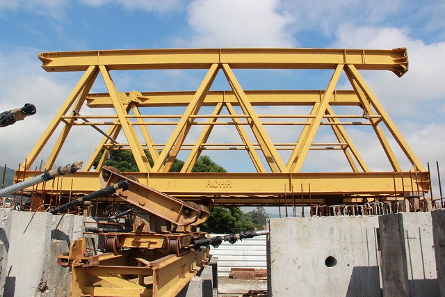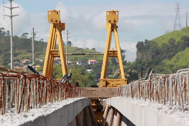 A lançadeira tem 90 metros de comprimento, por 2,5 metros de altura, com capacidade de içar 90 toneladas – cada viga da ponte pesa, em torno, de 65 toneladas. Ela vai ocupar três vãos da ponte (dos cinco que ainda restam para receber vigas). Trazida de São Paulo, a treliça veio desmontada e já está sendo remontada na frente de obras, estando operacional em poucos dias. Serão instaladas 20 vigas em cinco espaços restantes.