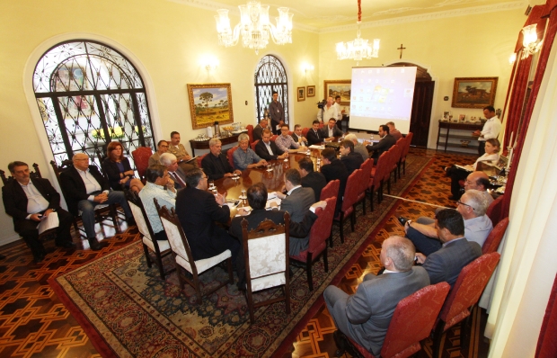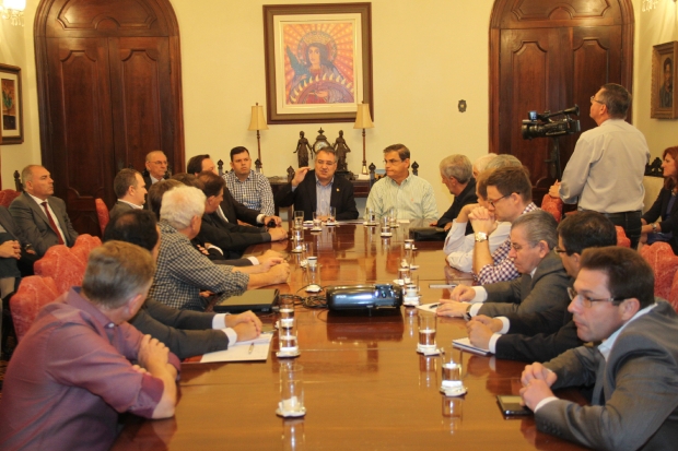 O governador Raimundo Colombo e o vice-governador Eduardo Pinho Moreira promoveram reunião com o colegiado pleno na manhã desta terça-feira, 12, para tratar de medidas de enfrentamento à crise econômica nacional e anunciar uma resolução do Grupo Gestor de Governo para barrar novas concessões de aumentos salariais a servidores públicos estaduais até o final deste ano.