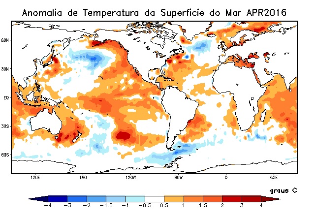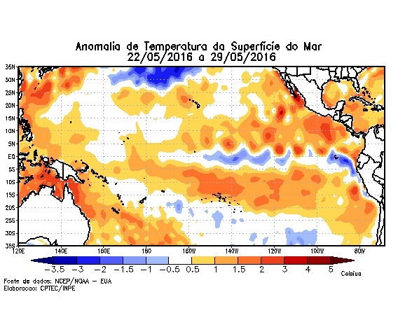 O monitoramento das condições oceânicas indica a persistência de anomalias positivas de TSM (Temperatura da Superfície do Mar) no Oceano Pacífico Equatorial cada vez menores, com tendência a configuração de neutralidade por dois meses seguidos (meses de inverno) e configuração de La Niña no final da estação mais fria do ano e, início da primavera.