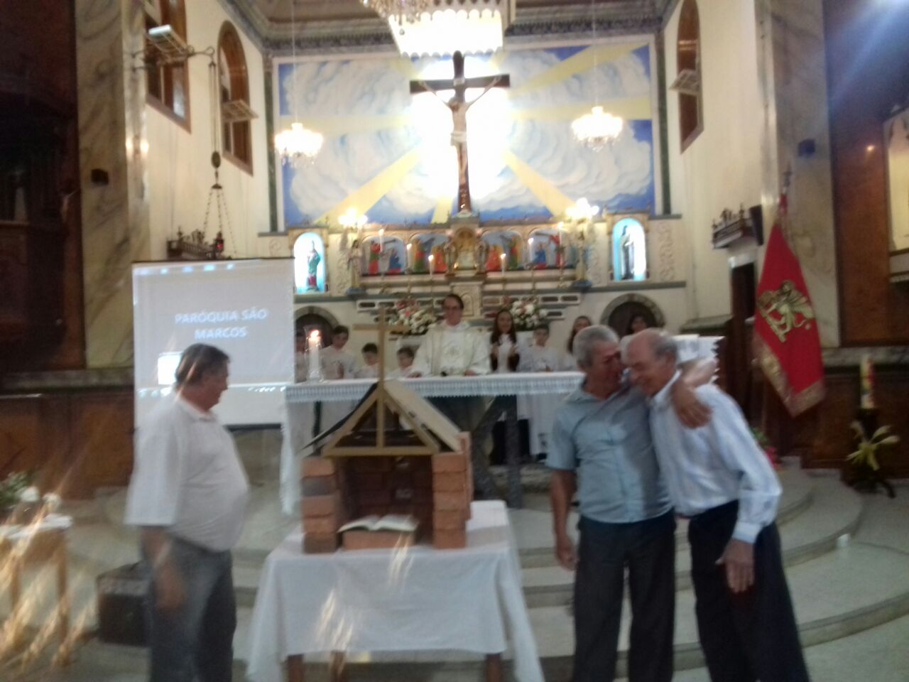 A celebração festiva contou com momentos de homenagens das comunidades e seus padroeiros e a representação de uma construção com tijolos para simbolizar a Igreja Matriz São Marcos.