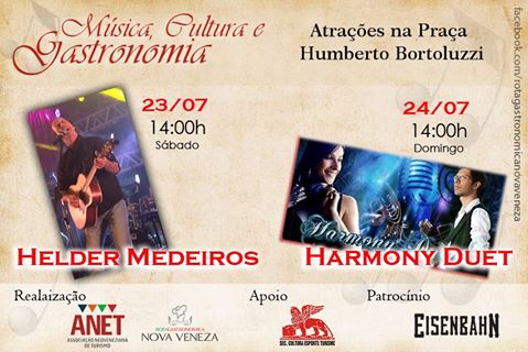 O projeto Música, Cultura e Gastronomia contará com duas apresentações neste sábado (23) e domingo (24) a tarde, no Coreto da praça Humberto Bortoluzzi. No sábado, sobe a palco Helder Medeiros, a partir das 14h e, no domingo, Harmony Duet. A ação é promovida pela Associação Neoveneziana de Turismo (ANET).