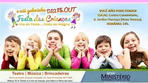 O Ministério Dependente Filhos do Rei em parceria com o Vereador Dalto Bortolotto promovem uma ação social para comemorar o Dia das Crianças, neste sábado, dia 15, das 14h às 18h, no Centro comunitário do Bairro Jardim Florença, em Nova Veneza. Durante toda a tarde, a criançada poderá aproveitar o espaço de leitura, atividades artísticas, esportivas, recreativas com brinquedos, além de peça teatral infantil. Ainda serão oferecidos guloseimas e ao final do evento uma lembrancinha de incentivo à leitura.