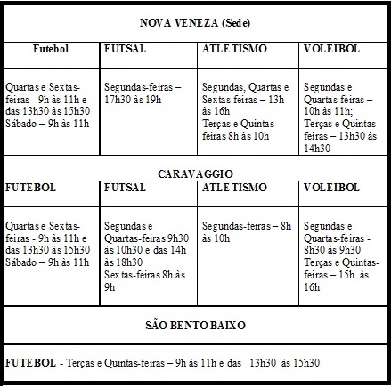 Segue abaixo o horário das escolinhas:
