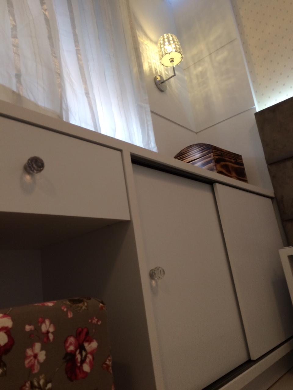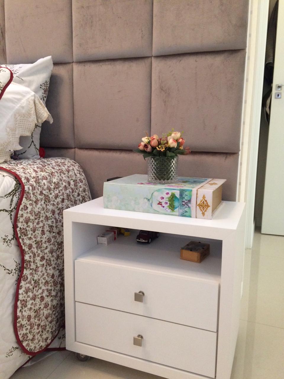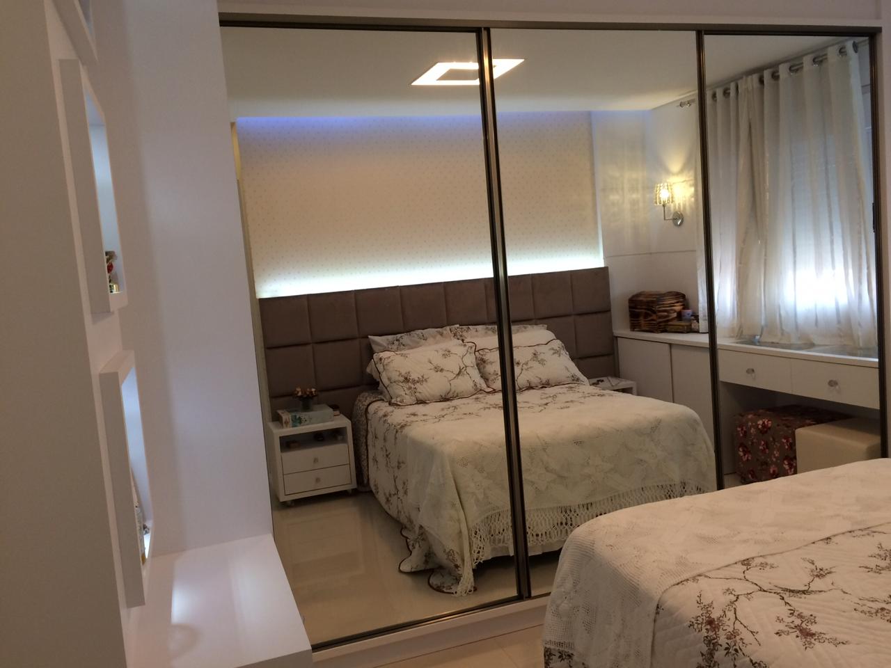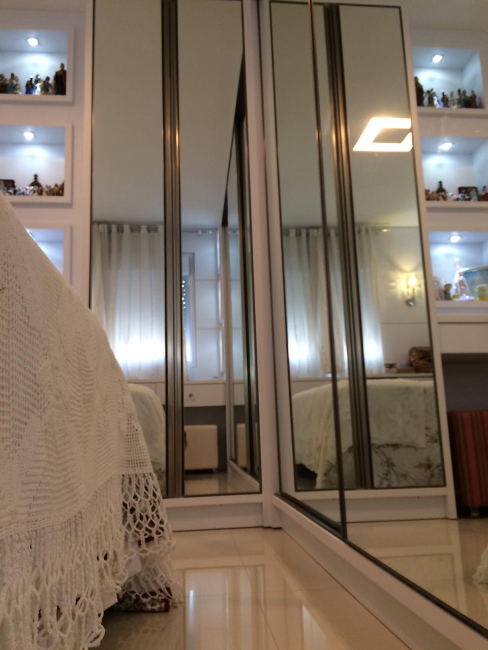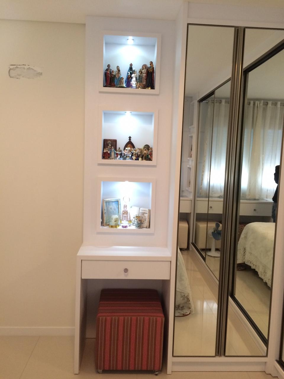 Já no dormitório suíte a proposta foi aproveitar cada cantinho e espaço, pensando em todos os detalhes desde o local adequado para roupas, sapatos, acessórios, maquiagem e um oratório (local para orações e imagens bíblicas). O uso da cor branca em todo o ambiente proporcionou tranquilidade, deixando o quarto clean e convidativo, além de utilizar o espelho prata em todas as portas do roupeiro causando amplitude e tornando o ambiente maior. A cabeceira estofada com iluminação de LED trouxe ao dormitório aconchego, possibilitando maior permanência no espaço projetado.