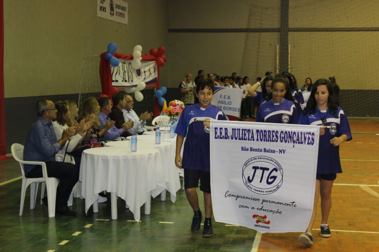 O jovem Erick Moises Albino da Silva, 15 anos conduziu o fogo simbólico. Em seu currículo, coleciona 16 medalhas em dois anos de participação no Jevs, além de ser campeão dos JESC (Jogos Escolares de SC), na modalidade de Pentatlo e campeão dos Jogos Escolares Brasileiros no revezamento 4 X 100 conquistado deixou uma mensagem aos alunos. “Ganhar é ótimo, claro! Mas, se você realmente quer conquistar coisas na vida, o segredo é aprender a perder”.
