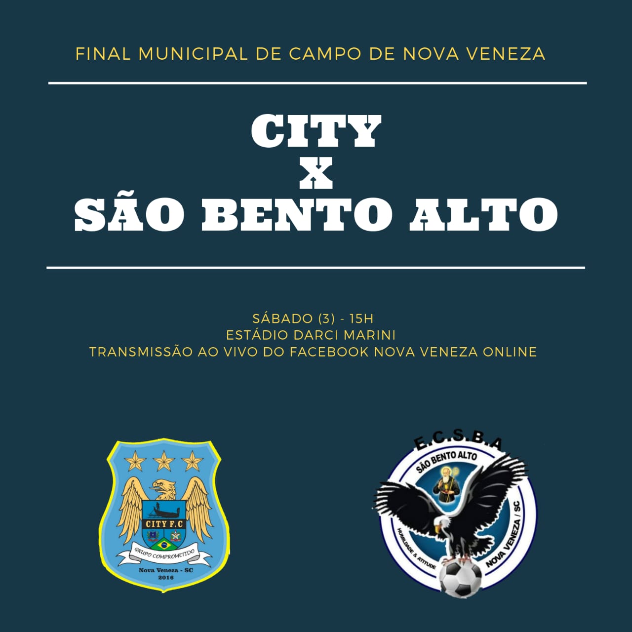 Agora, City e São Bento Alto se enfrentam no sábado (3) às 15h, no estádio Darci Marini, para definir o grande vencedor do campeonato. O jogo terá transmissão ao vivo do Facebook Nova Veneza Online.