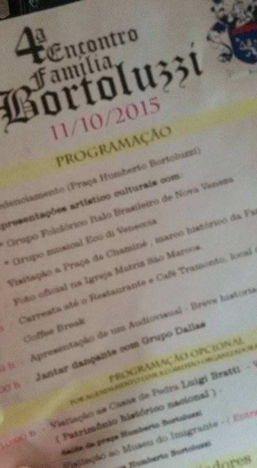 Após 12 anos, os descendentes dos imigrantes Giuseppe, Giovanni e Humberto Bortoluzzi irão se reunir para confraternizar a 4ª edição do Encontro da Família Bortoluzzi, que acontecerá neste domingo, dia 11, em Nova Veneza. Já estão confirmados mais de 320 participantes vindos de diversos estados como São Paulo, Paraná, Rio Grande do Sul, entre outros. Entre os convidados as três filhas de imigrantes: a Iracema com 98 anos, a Maria com 96 anos e a Irmã com 85 anos.