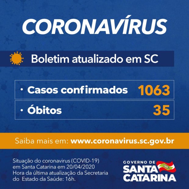 Coronavírus em SC: Governo do Estado confirma 1.063 casos e 35 mortes por Covid-19