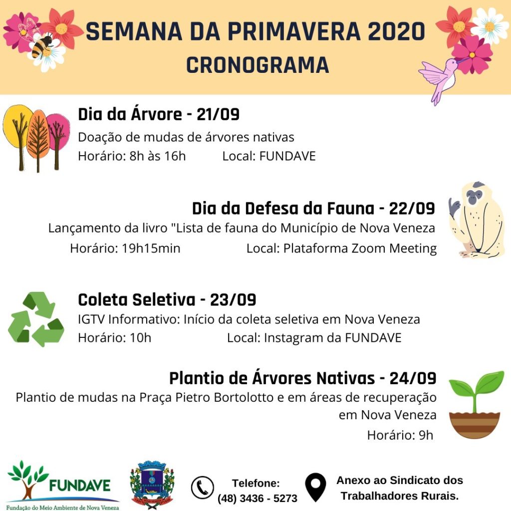 Em comemoração a Semana da Primavera, a Fundação do Meio Ambiente de Nova Veneza (FUNDAVE) irá promover série de atividades para comemorar a entrada dessa estação que é marcada pela floração de diversas plantas.