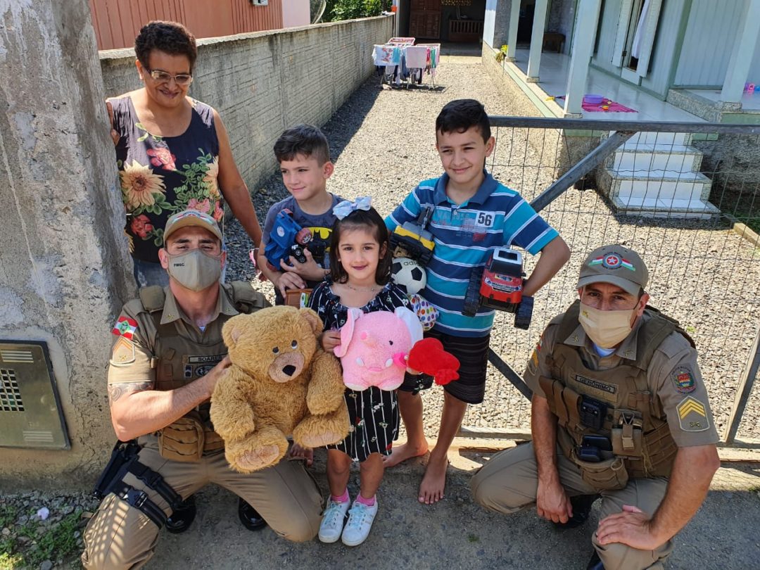 Polícia Militar de Nova Veneza entrega brinquedos no Dia das Crianças