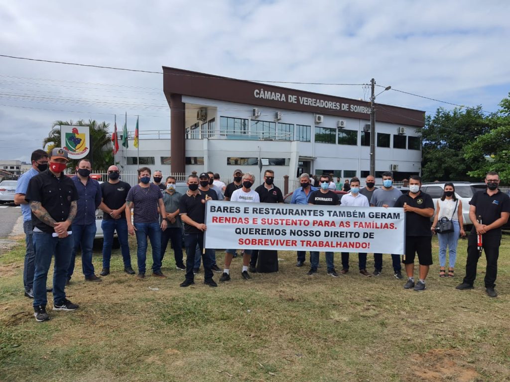 Representantes de empreendimentos gastronômicos e bares participam de manifestação durante ato do governador em Sombrio