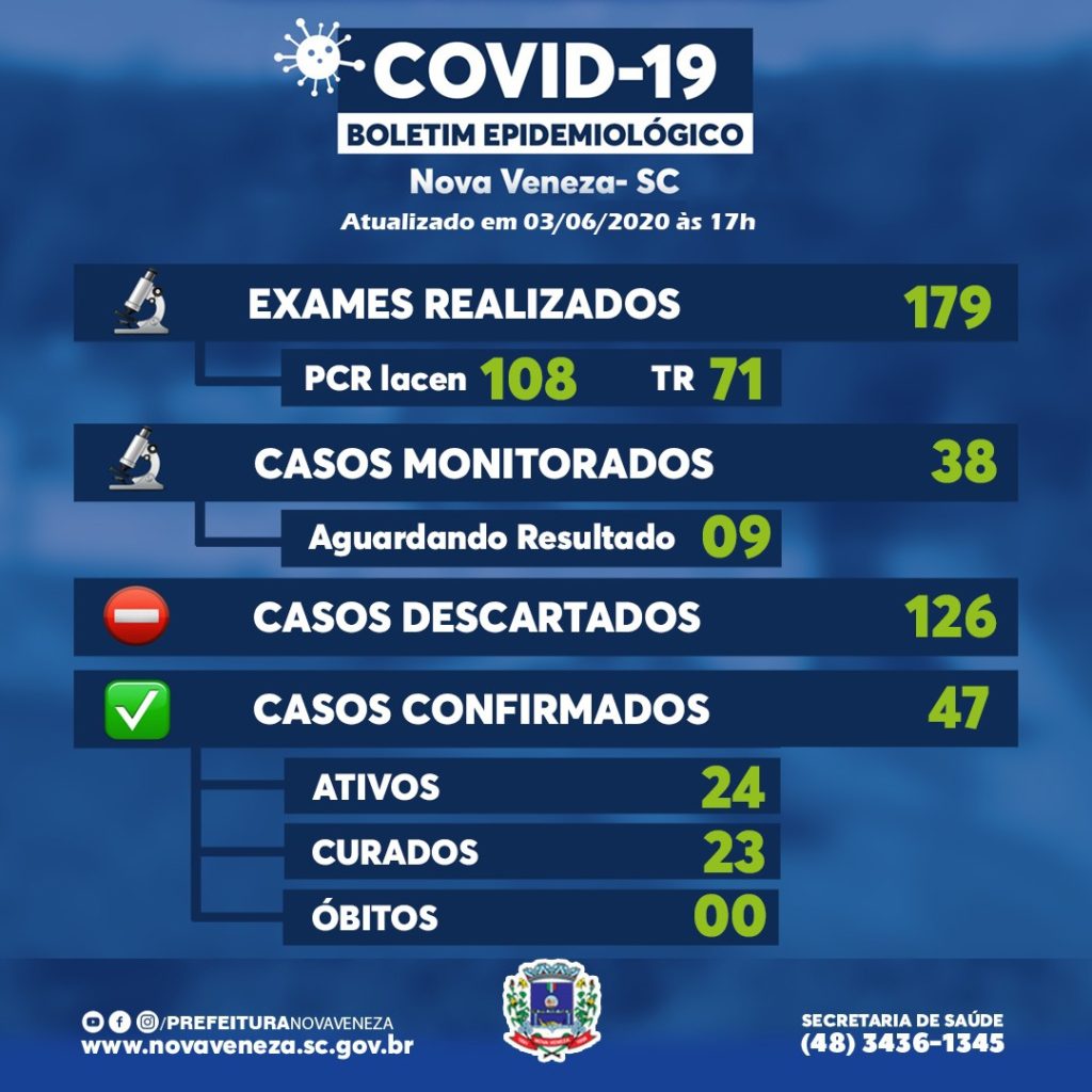 A Secretaria Municipal de Saúde, através da Vigilância Epidemiológica divulgou nesta quarta-feira, dia 03 de junho, dois novos casos confirmados do coronavírus, em Nova Veneza. Ao todo, chegam a 47 testados positivo e 24 ativos no município. Ainda no quantitativo 23 pessoas foram curadas, o número de casos suspeitos soma 38 e 126 foram descartados.