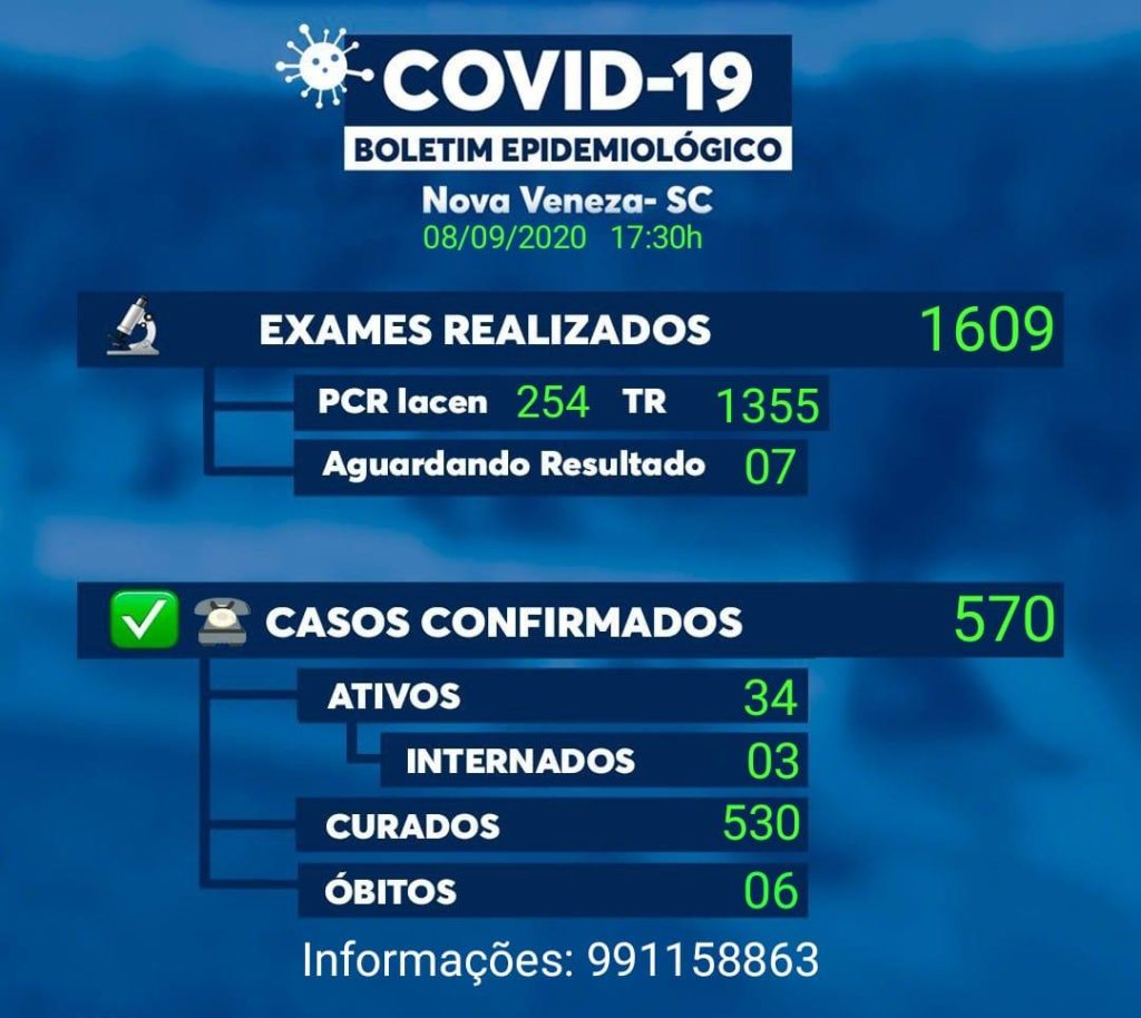 A Vigilância Epidemiológica de Nova Veneza divulgou nesta terça-feira (08), sete pacientes contaminados e nove altas da covid-19. Os pacientes testaram positivo após realizarem TR (Teste Rápido).